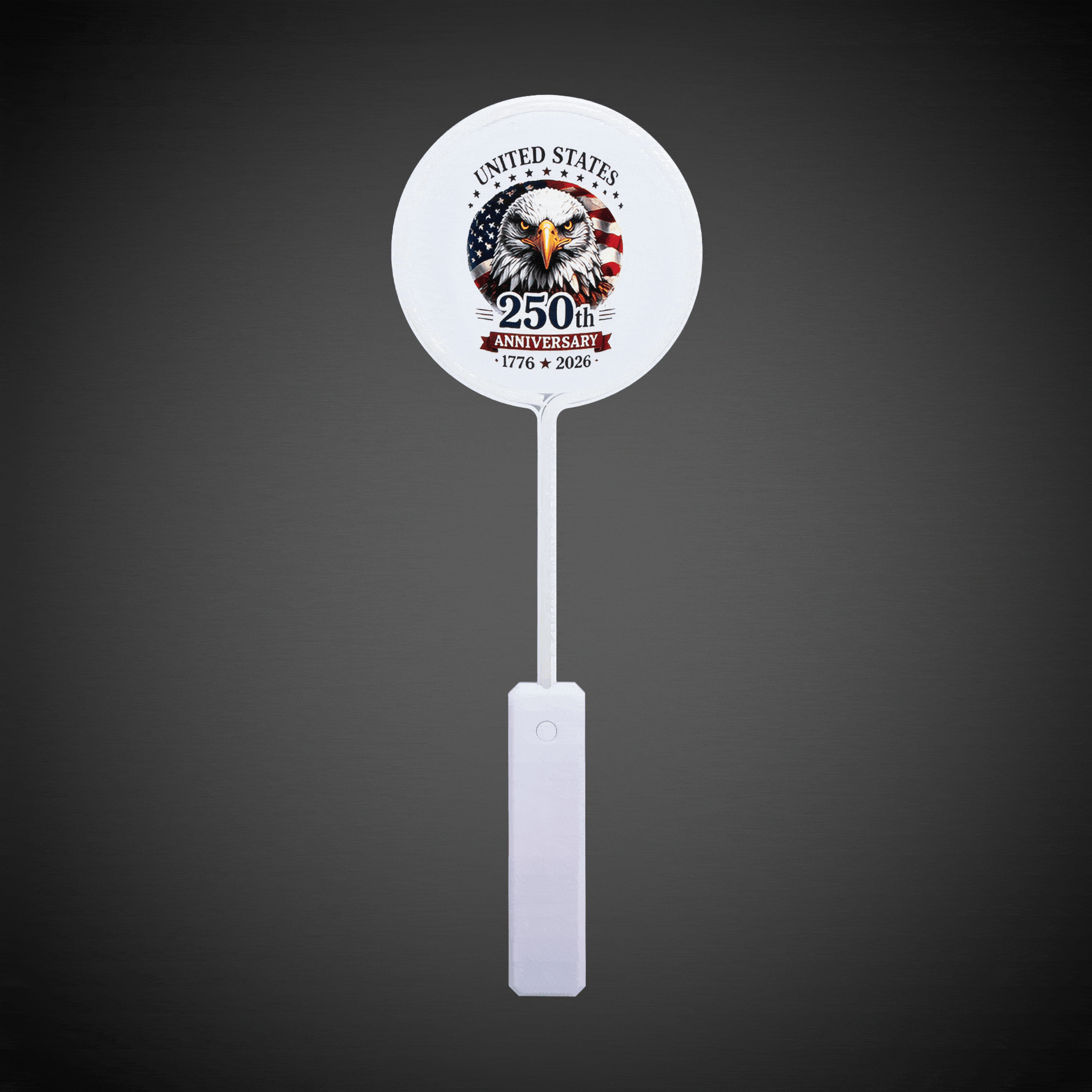 Light up your 250th Anniversary festivities with our limited edition 18" LED White Circle Wand, designed with a flat 11" long handle for easy gripping & maneuverability, with a 6" diameter top featuring an American eagle & flag. This commemorative LED wand features 3 unique light functions, allowing you to create stunning visual effects at any semiquincentennial event this July. Powered by the included (3) AAA batteries, it’s ready to dazzle and is perfect for Fourth of July parties, parades, or any patriotic celebrations where you want to shine. Each wand is sold individually. Please order in increments of 1 wand. SKU: PAT270EA