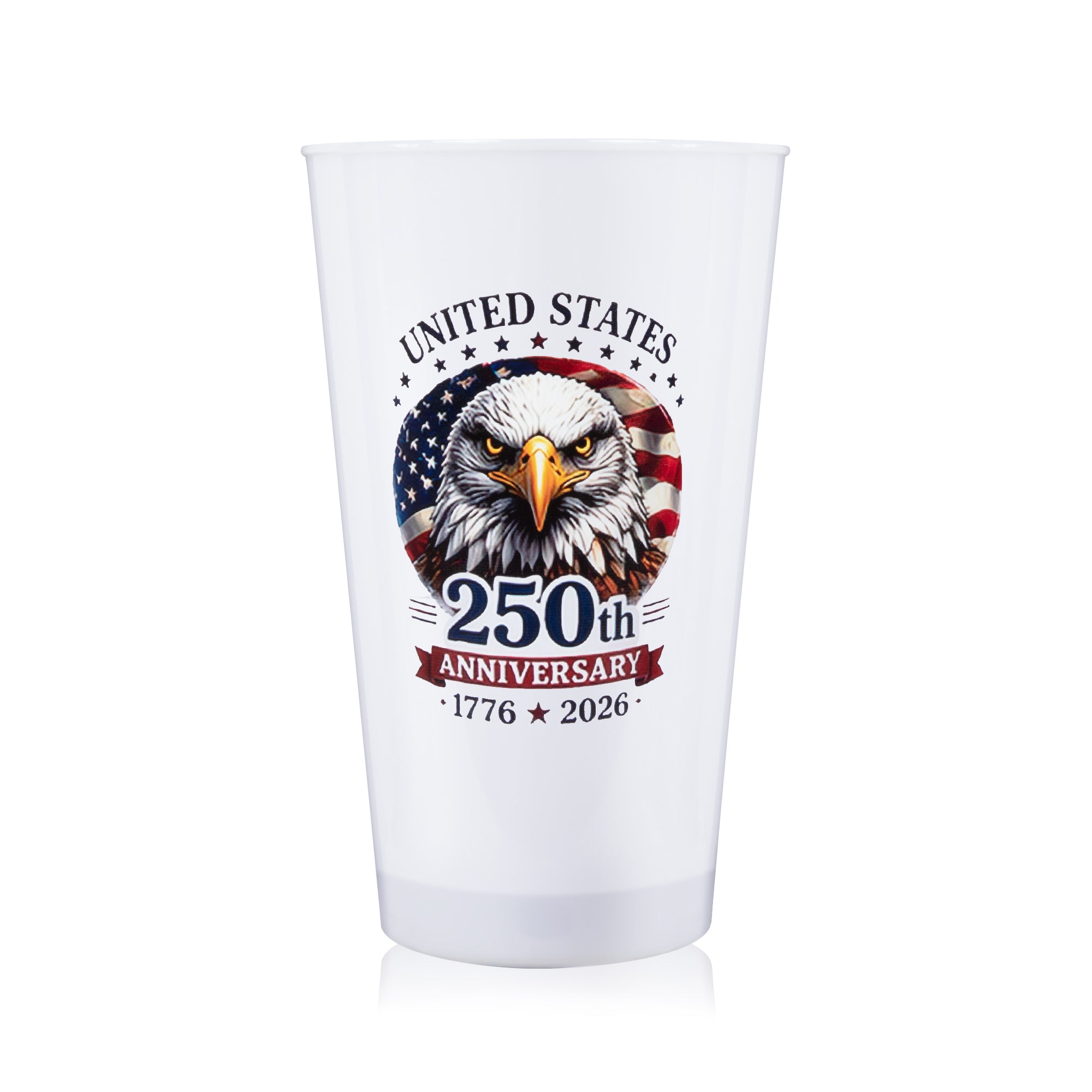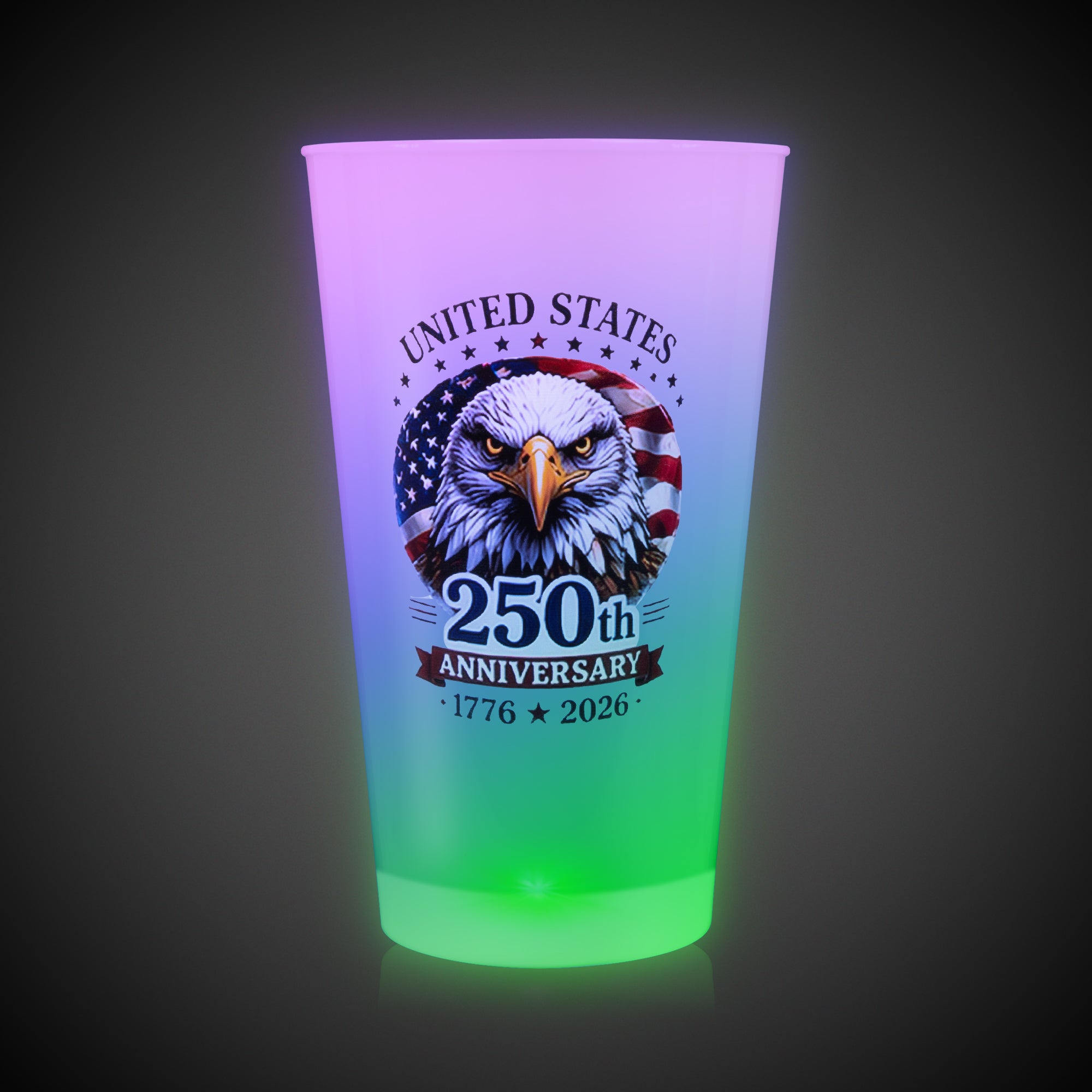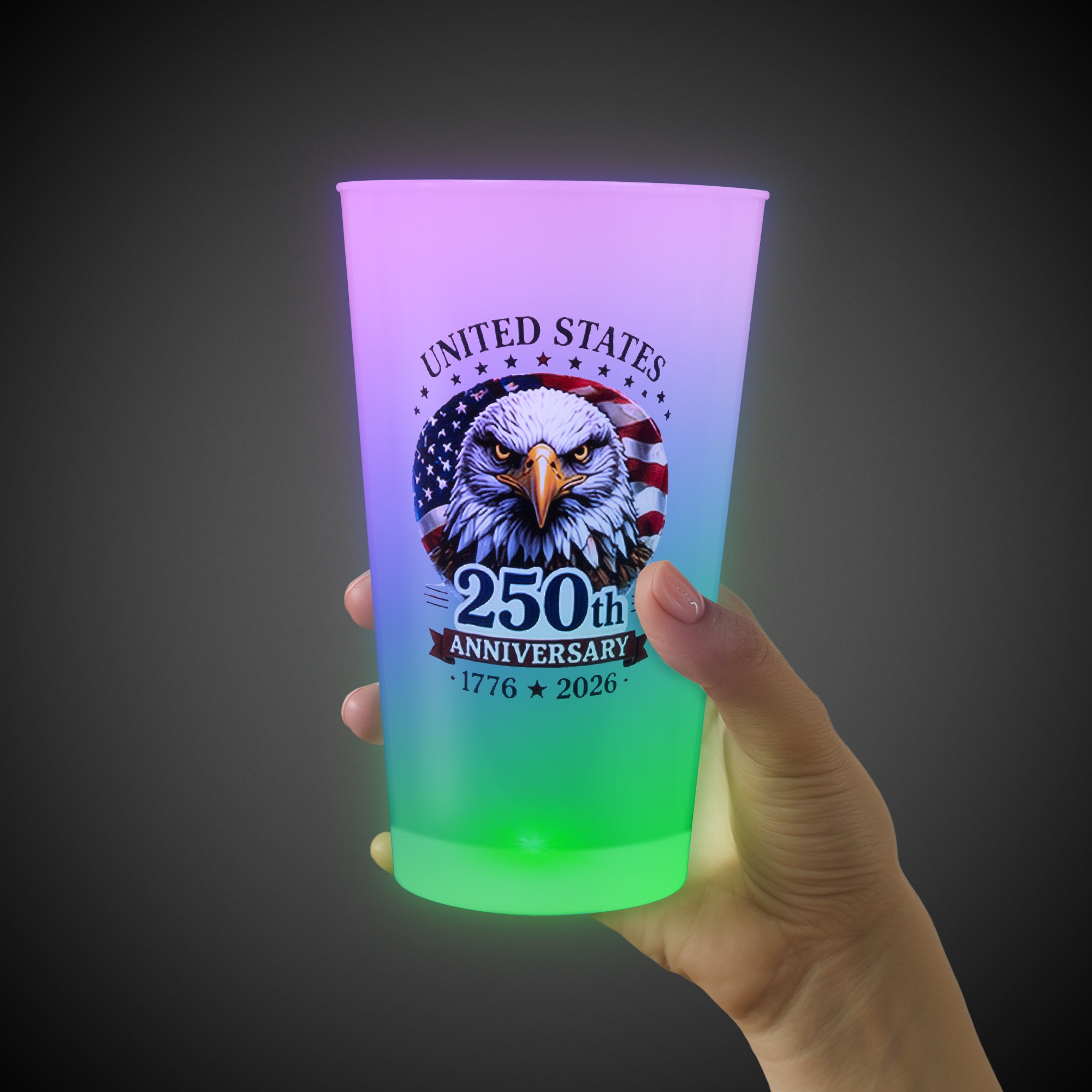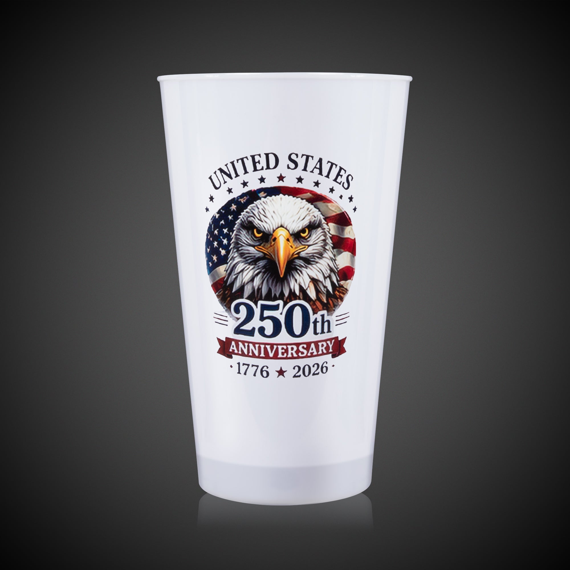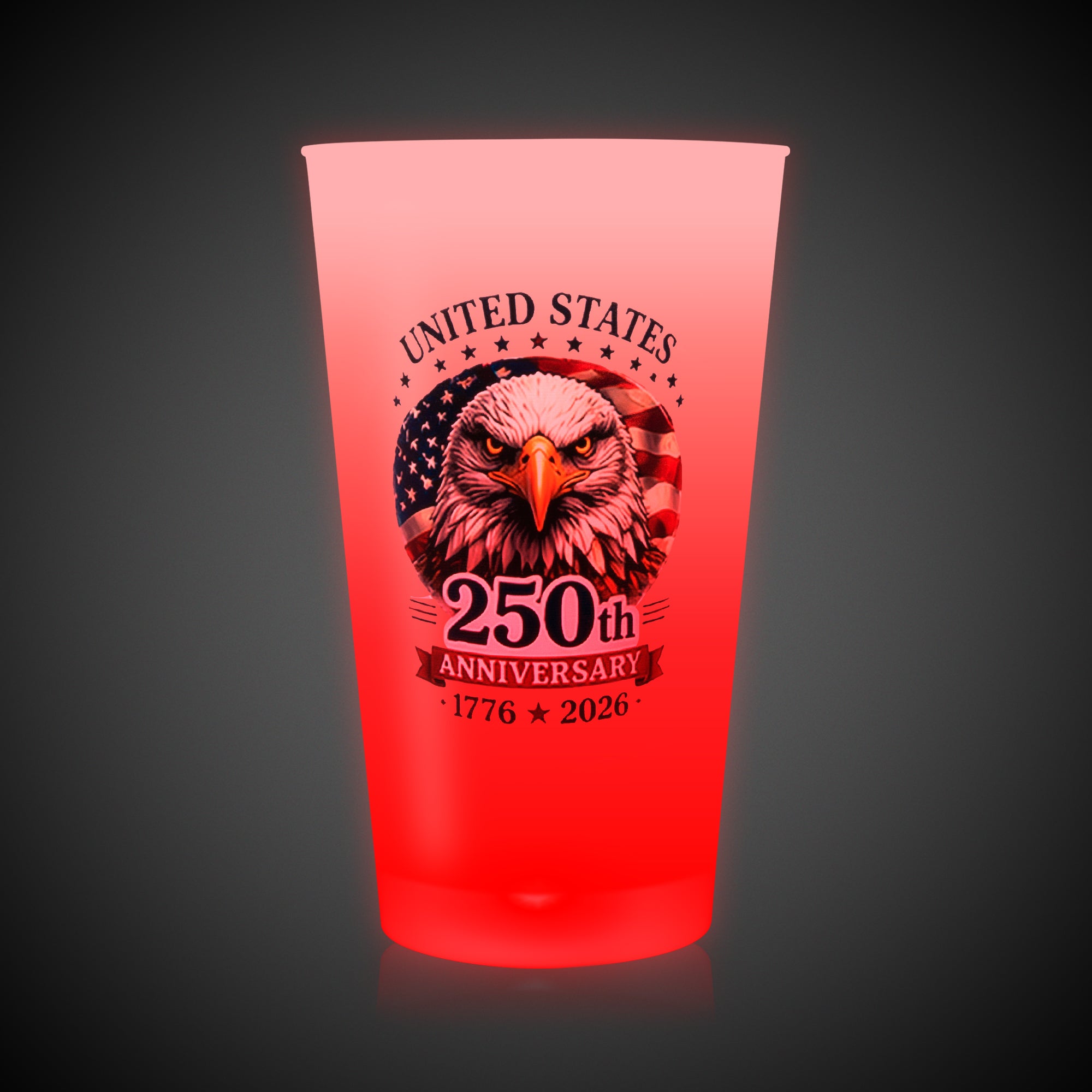 Serve up a good time with our limited-edition 250th Anniversary LED 16 oz. Multi-Color Cup! This 16-oz. light-up patriotic cup with an American flag & eagle design is a great addition to your patriotic celebrations this summer. Our LED 16 oz. cup is made of opaque white acrylic with high-powered multi-color LEDs that will light up your drinks in style for the big night of fireworks & festivities. Hand-washable & reusable, these light-up cups will keep the fun going drink after drink! This LED cup comes with (3) AG13 batteries that are included, installed, and replaceable. Sold by the individual cup. SKU: PAT513EA