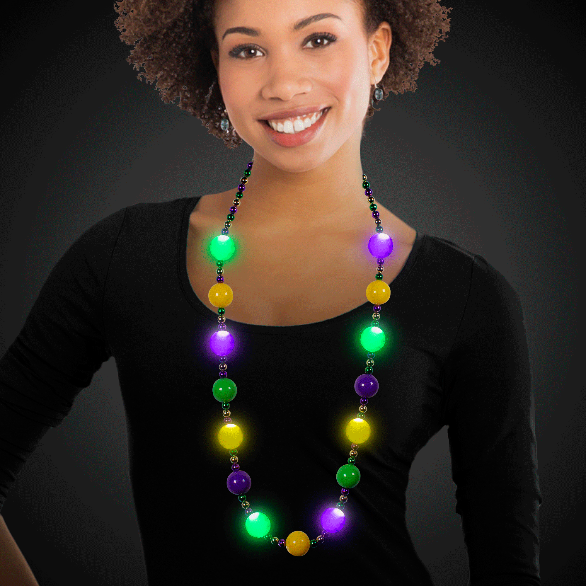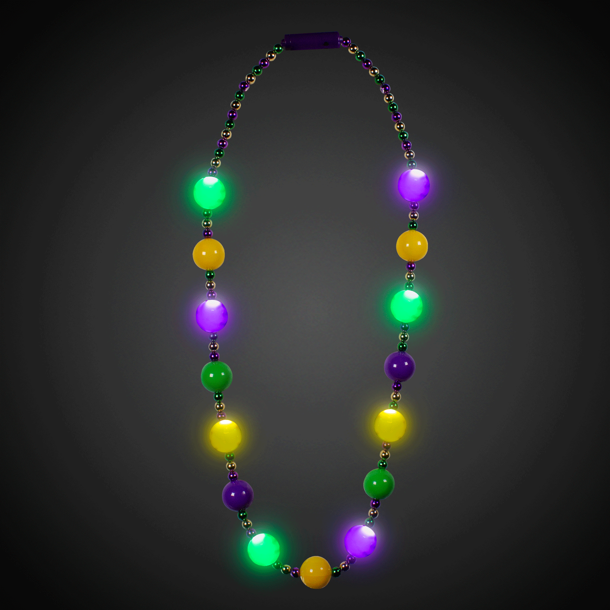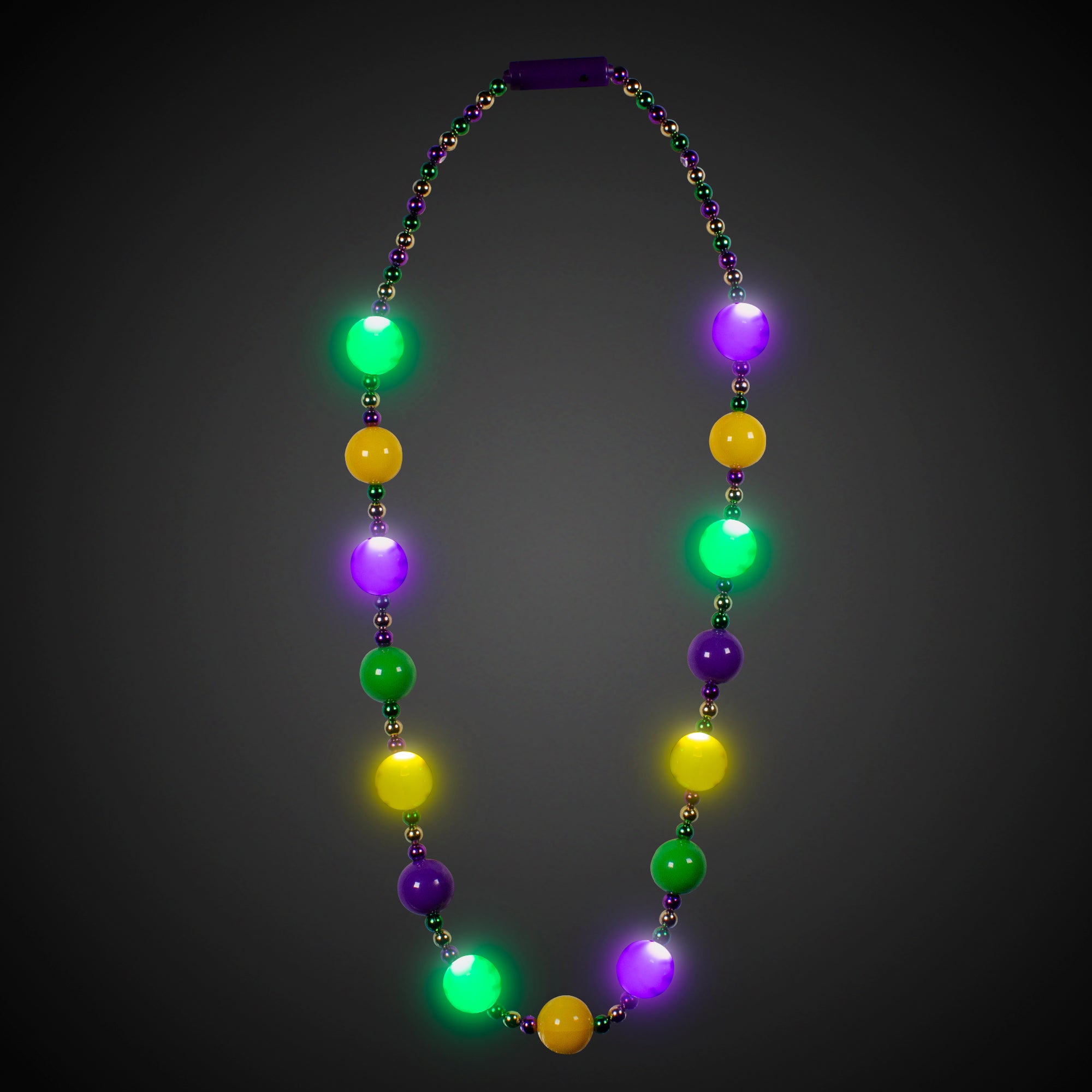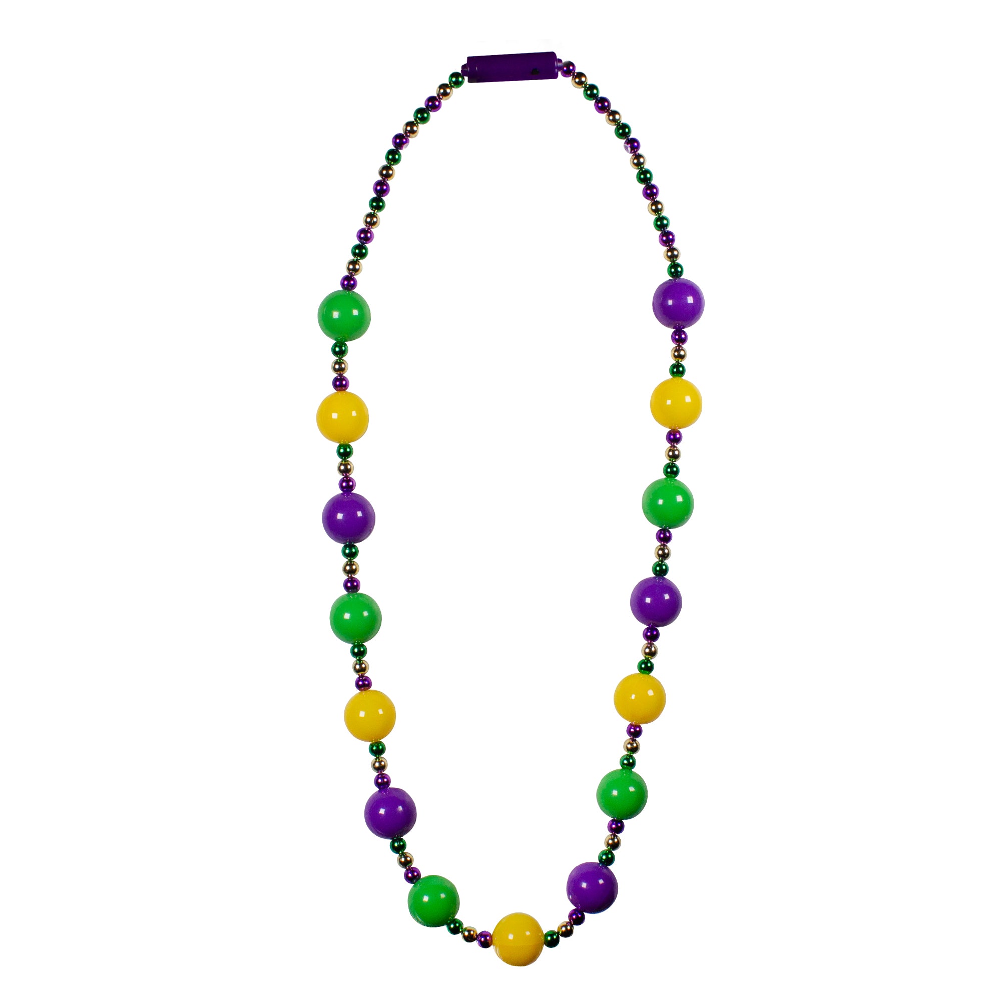 Get ready to glow in traditional Fat Tuesday style with this eye-catching LED Mardi Gras 46" Ball Beads Necklace. Featuring 15 jumbo 30mm beads in alternating green, gold, and purple, this accessory delivers serious festive flair. The best part? 8 of those gorgeous balls are equipped with brilliant LED lights that instantly grab attention and keep the celebration going strong. Batteries are included & installed, so you can start turning heads right away at parades & parties. Sold by the individual necklace. Please order in increments of 1 necklace. SKU: JLR280EA