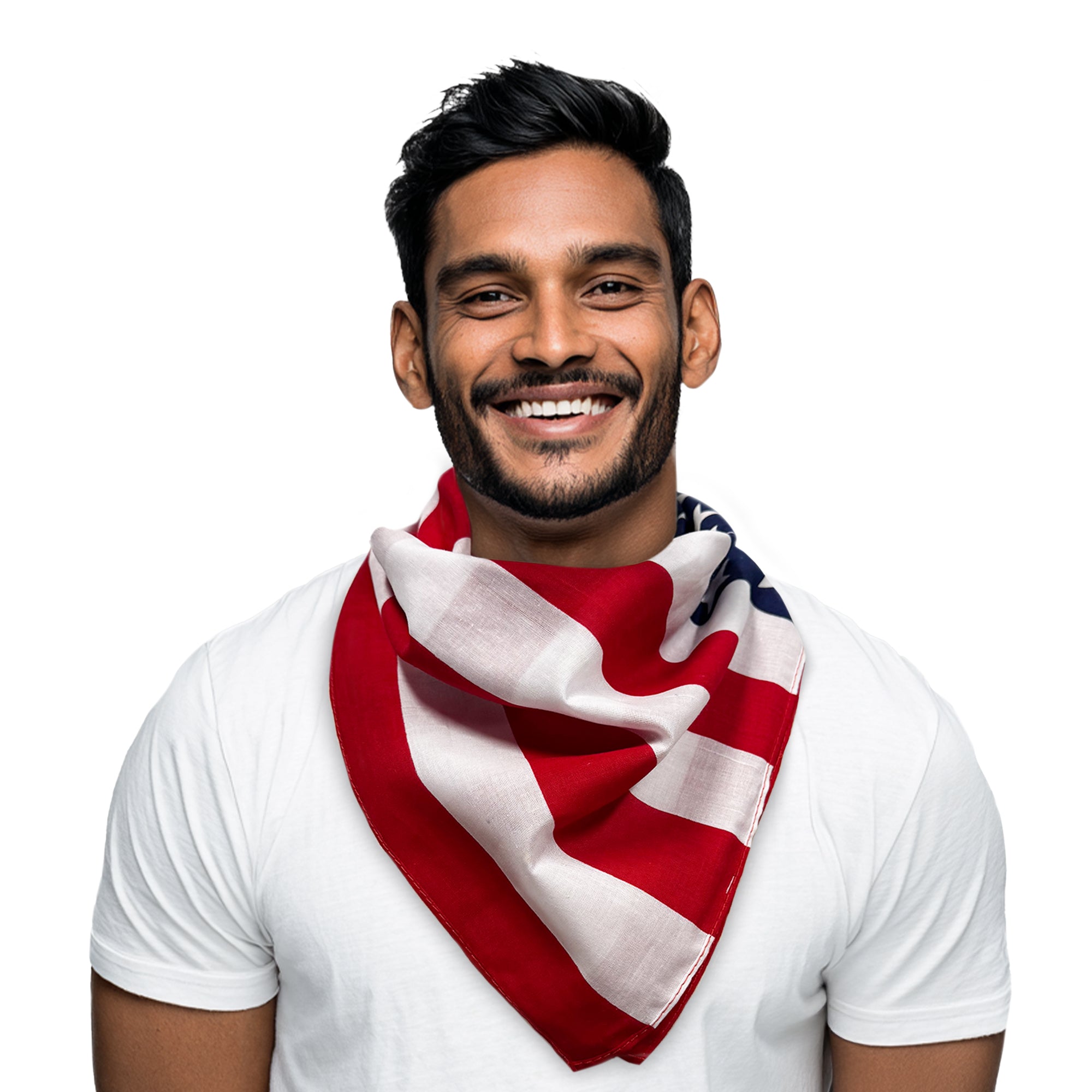 Use our bright and bold American Flag cotton bandanas for all your patriotic events. Our 100% cotton 22" red, white, and blue bandanas are bright in color and make perfect accents to Patriotic theme costumes and decorations! American Flag Bandanas can be used as a cloth napkin for your Patriotic events, too. Our 22" x 22" stars and stripes adorned cotton American flag bandanas are printed on both sides and are sold by the dozen. Please order in increments of 1 pack. SKU: APR010DZ