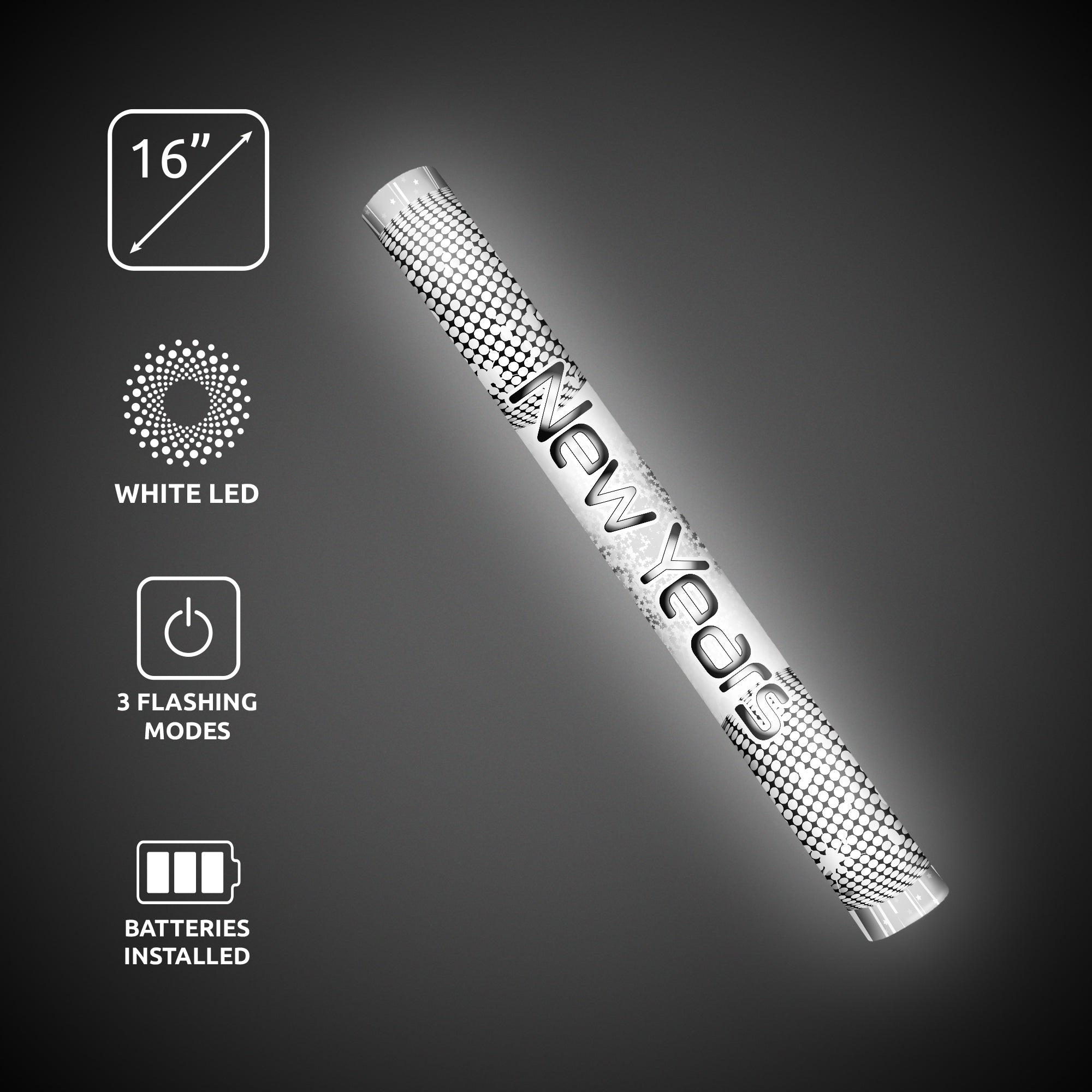 Light up New Year's Eve parties with our 16" light up New Year's Eve baton. This foam baton features a fabulous design covering a 16" foam baton embedded with bright LED's. Choose from a variety of light functions with a click of the on/off button. Our Happy New Year Lumiton Baton features bright white LEDs that illuminate the great wrap around the decal. Our New Year's Eve Baton makes a great hand out at NYE parties and will light up the night as you ring in the new year. Batteries included & installed. SKU: LUM216EA