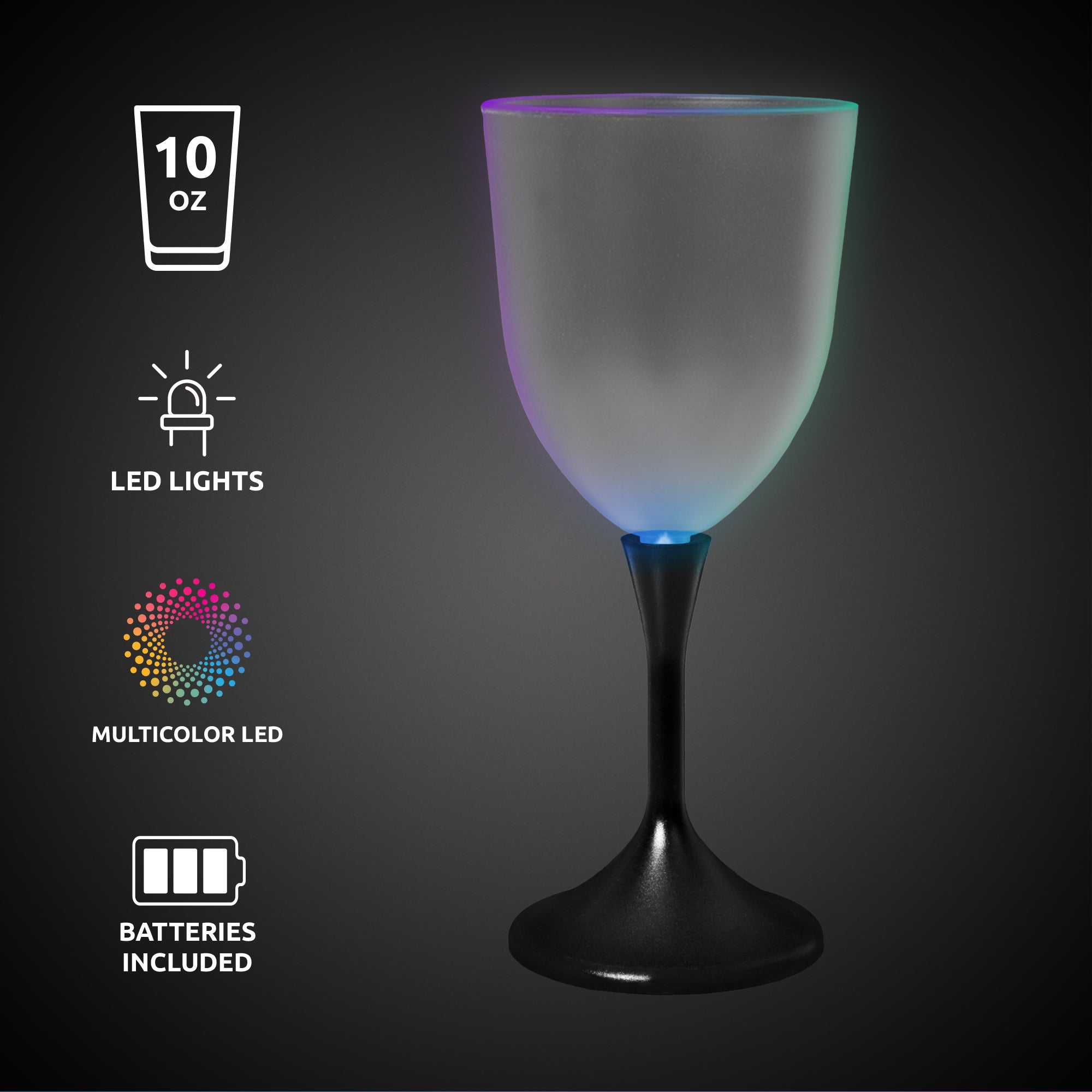 Light up your next nighttime event in style with our LED 10 oz. Frosted Wine Glass Black Stem. This 10-oz. multi-color light-up wine glass is made out of high-quality frosted acrylic with a black stem, which holds 3 high-powered LEDs: 1 red, 1 green, and 1 blue. With the flip of a switch, you can choose from a variety of lighting modes to match your party decor, including flashing combinations of colors, constant on, and rotation of all 3 colors.