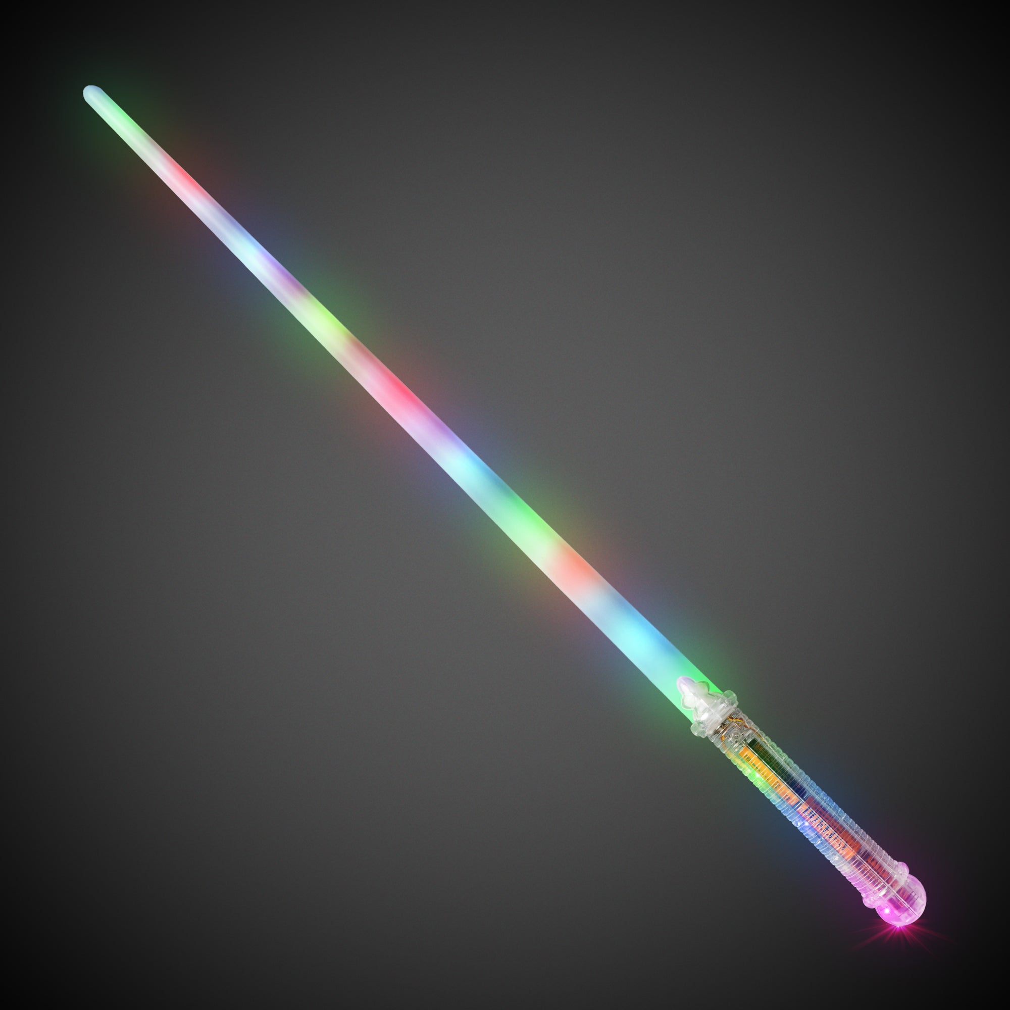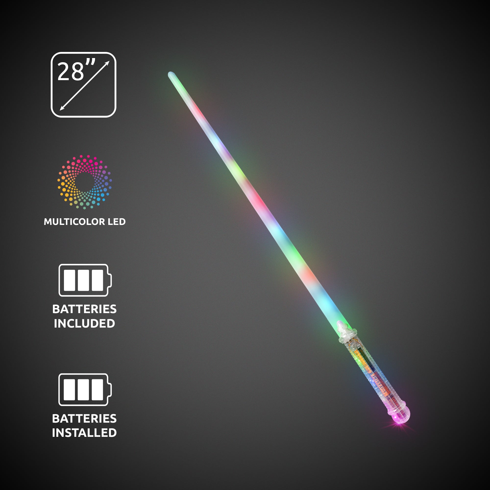 Arrive at your next duel with one of our 28" LED Sword with Clear Handle and your opponent will be so wowed they'll surrender in surprise! These light-up swords are the perfect party favors for space, medieval, or ninja-themed birthday parties and will also make any Halloween costume look amazing at night! This sword measures 28" long and features bright multi-color LED lights. The lights even shine bright through the clear handle! 3 x AA batteries included & installed. Sold by the individual sword. Please order in increments of 1 sword. SKU: WEA1016EA