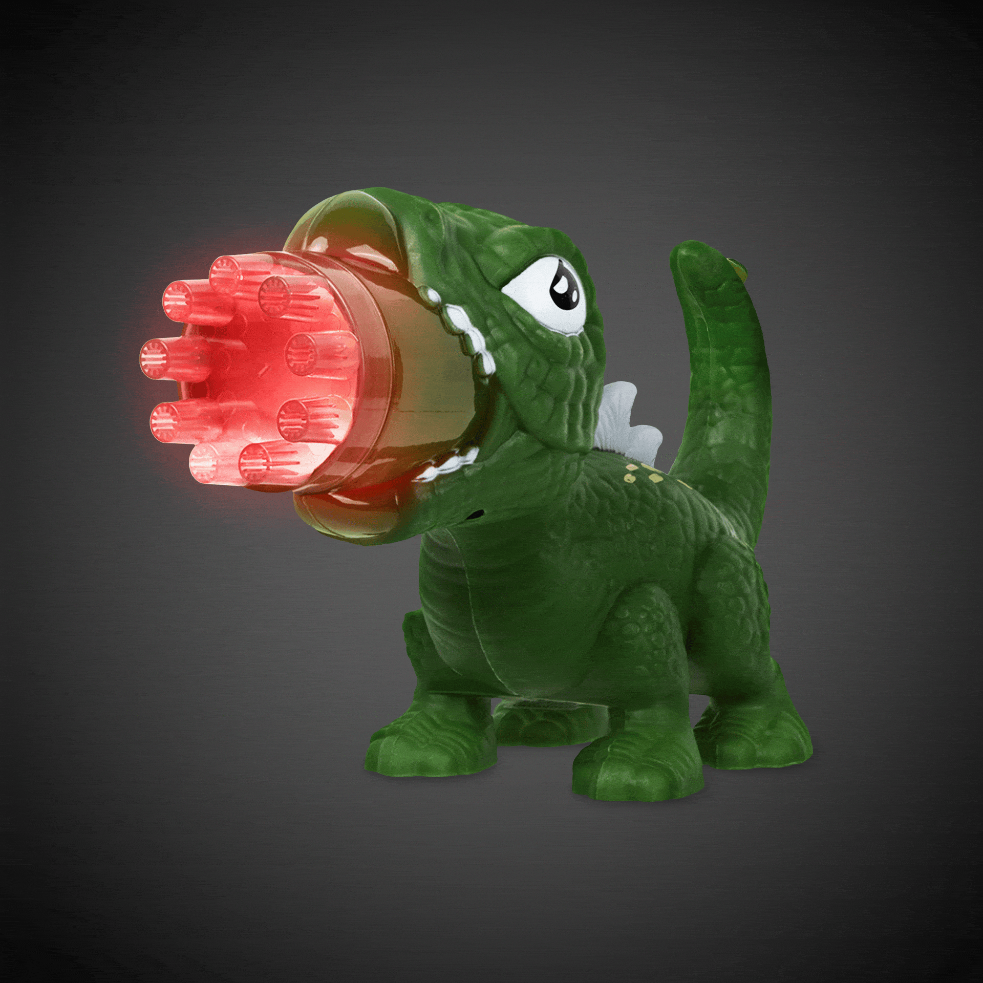 Dinosaur lovers will adore our green LED Dinosaur Bubble Blaster. Perfect for hours of nighttime bubble fun with bright LEDs. Each Dino Bubble Blaster is 8" x 5 1/2" in size and comes in a box with a jar of bubbles. Sold by the individual bubble gun. Please order in increments of one bubble gun. SKU: BUB082EA