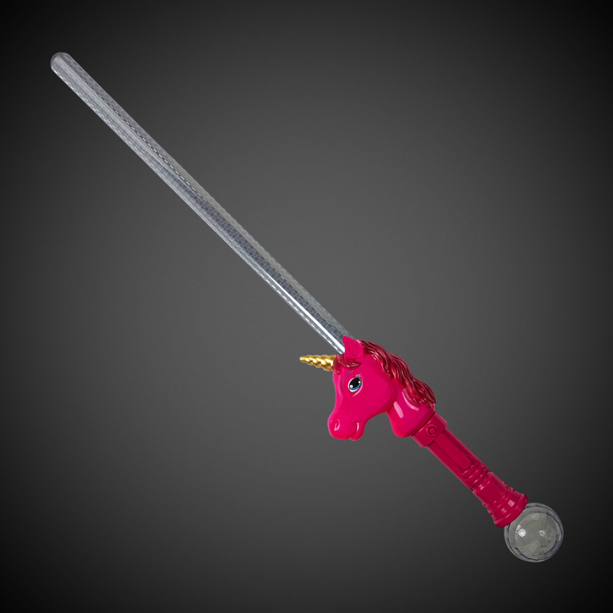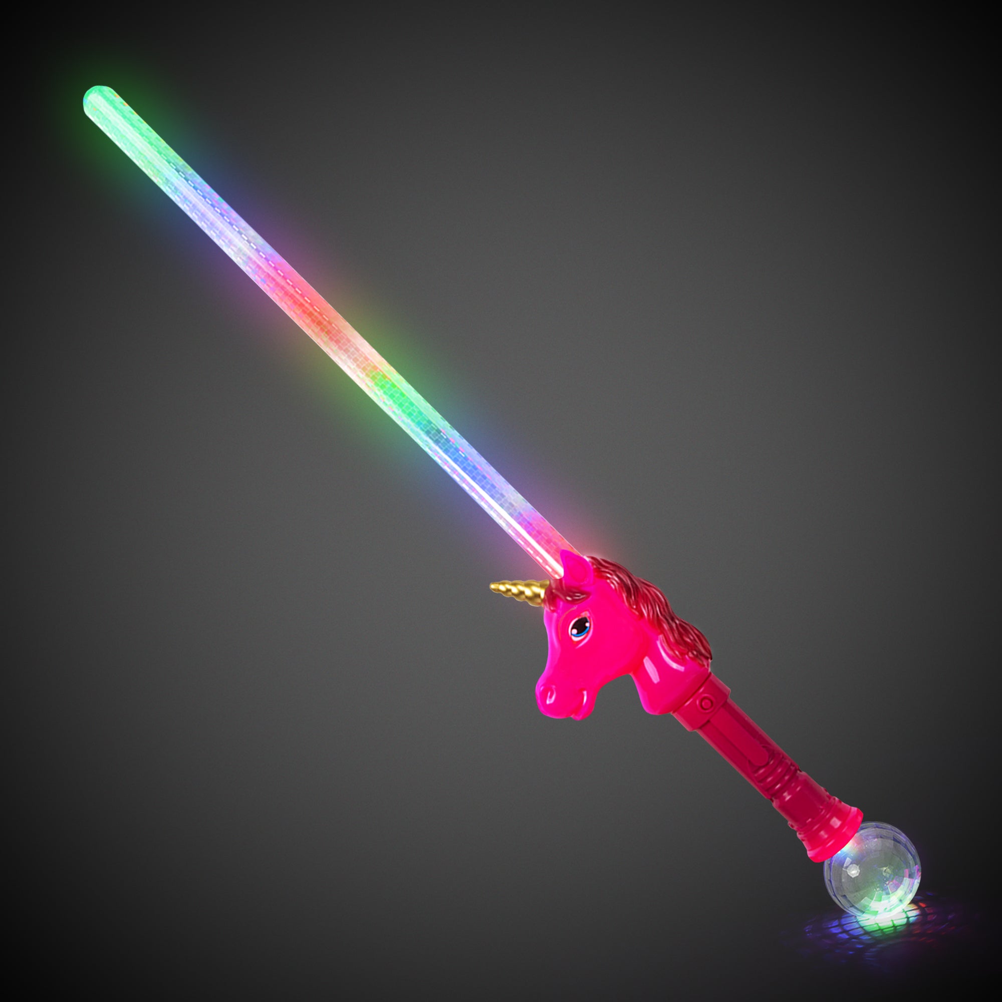 Embark on magical adventures with this enchanting 28" LED Pink Unicorn Sword, a radiant companion for any fantasy quest. Boasting an exquisite pink unicorn-themed handle adorned with a dazzling prism ball, this luminous blade captivates with 9 brilliant LEDs that shimmer in red, green, and blue across multiple dynamic flashing modes. Whether you're hosting costume galas, magical-themed celebrations, or Halloween extravaganzas, this spellbinding sword makes an unforgettable gift and party essential. Batteries included & pre-installed for instant enchantment! Sold by the individual sword. Please order in increments of 1 sword. SKU: WEA1086EA