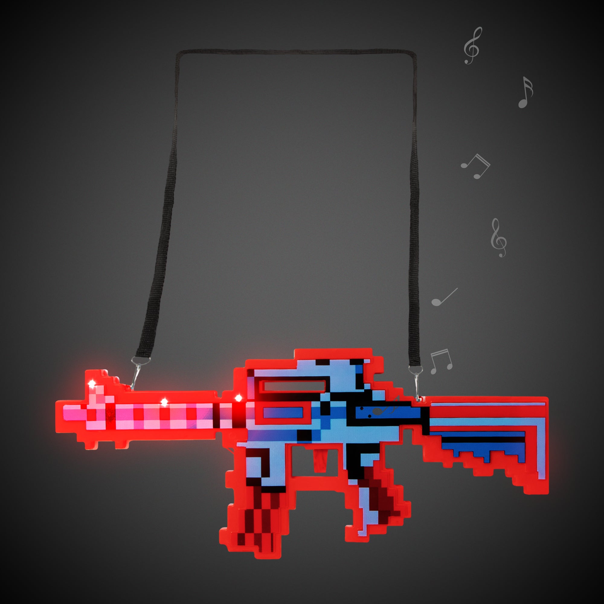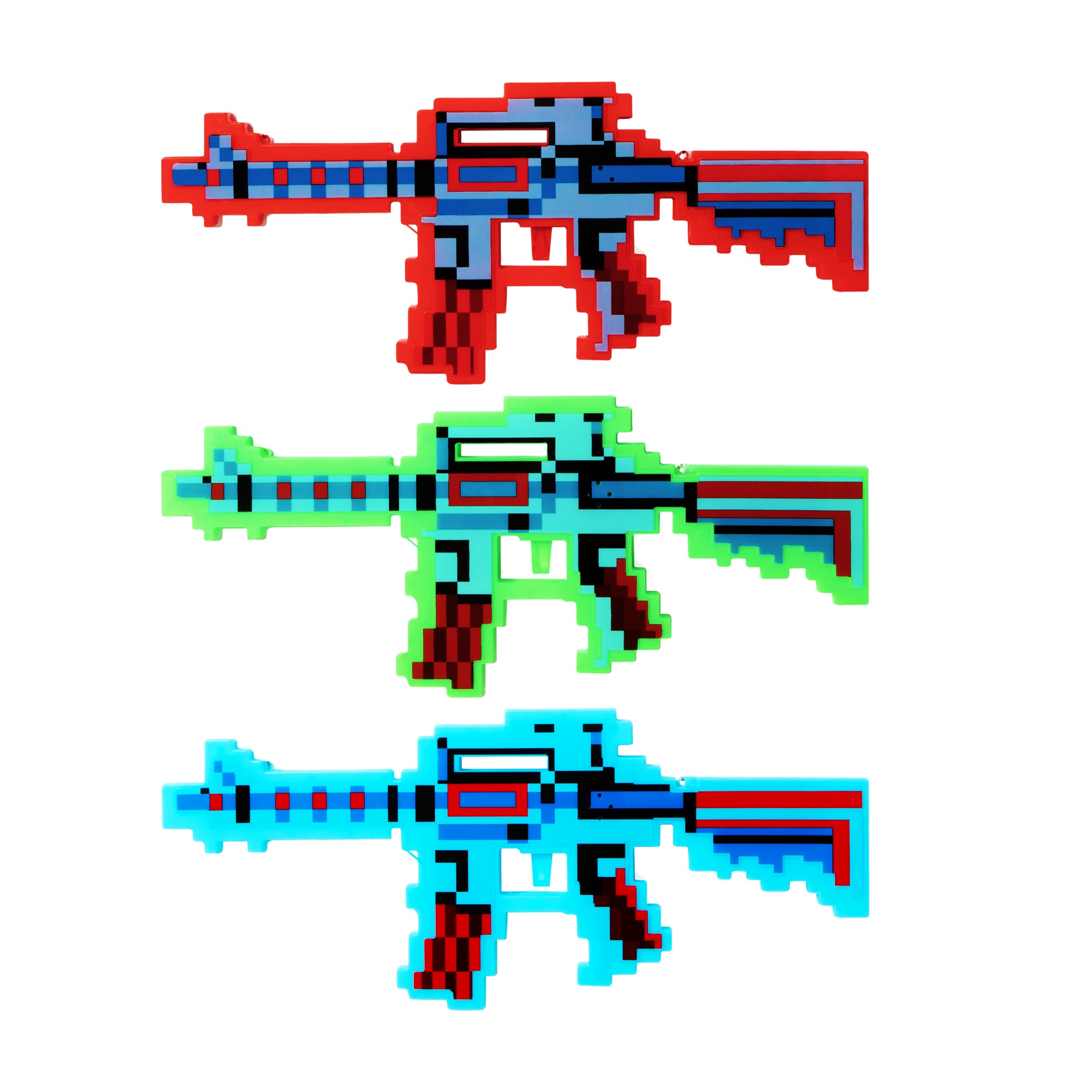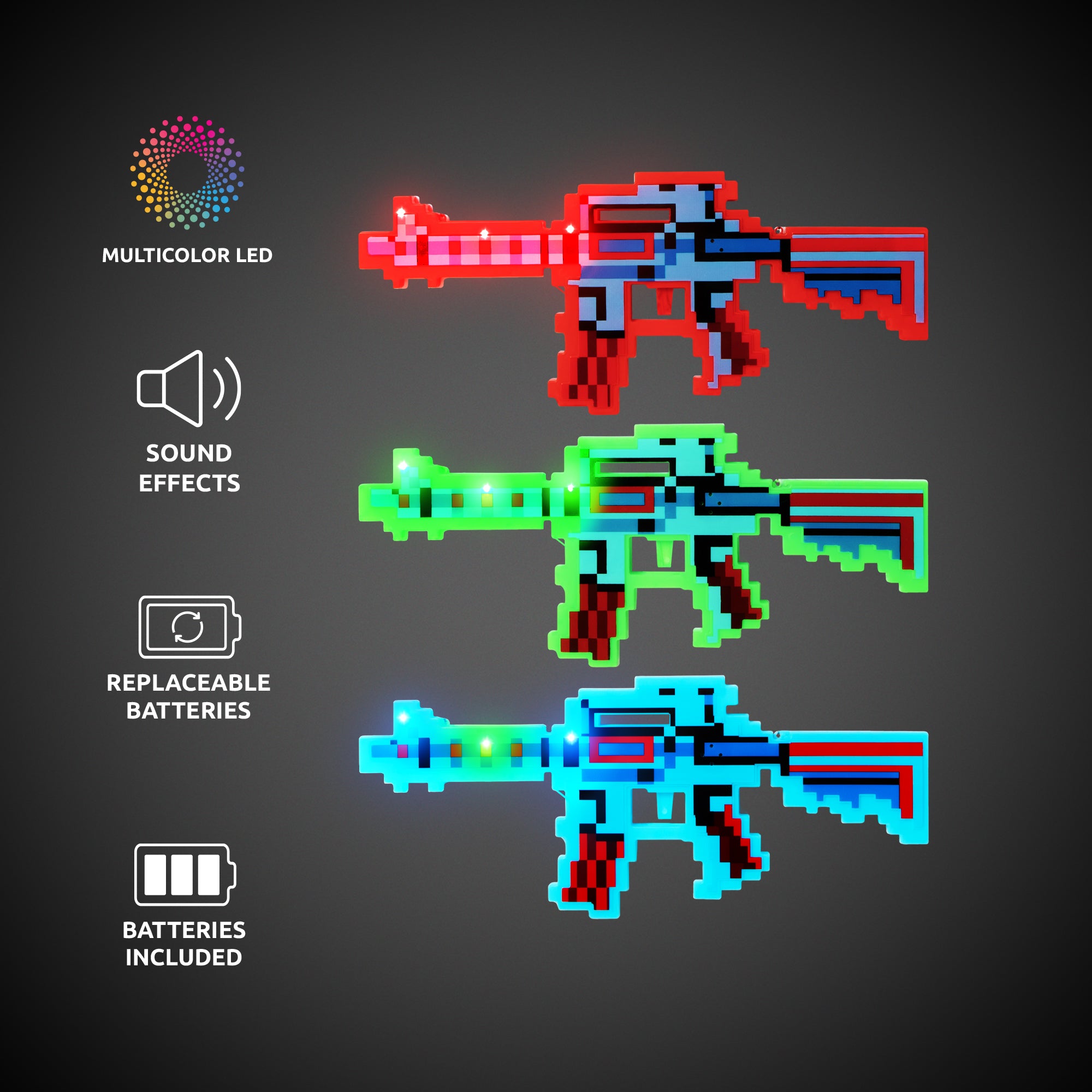 Feel like you're in a video game when playing with our LED Pixel Machine Guns with Sound. This 3-pack of light-up toy weapons includes a red, green and blue toy gun that each measure 15 1/4" long by 7" tall by 1/2" thick and feature super bright LED's and make sound! Each gun takes (3) included AA batteries. Perfect for redemption and vending, too. Sold 3 guns to a pack. Please order in increments of 1 pack. SKU: WEA091UN