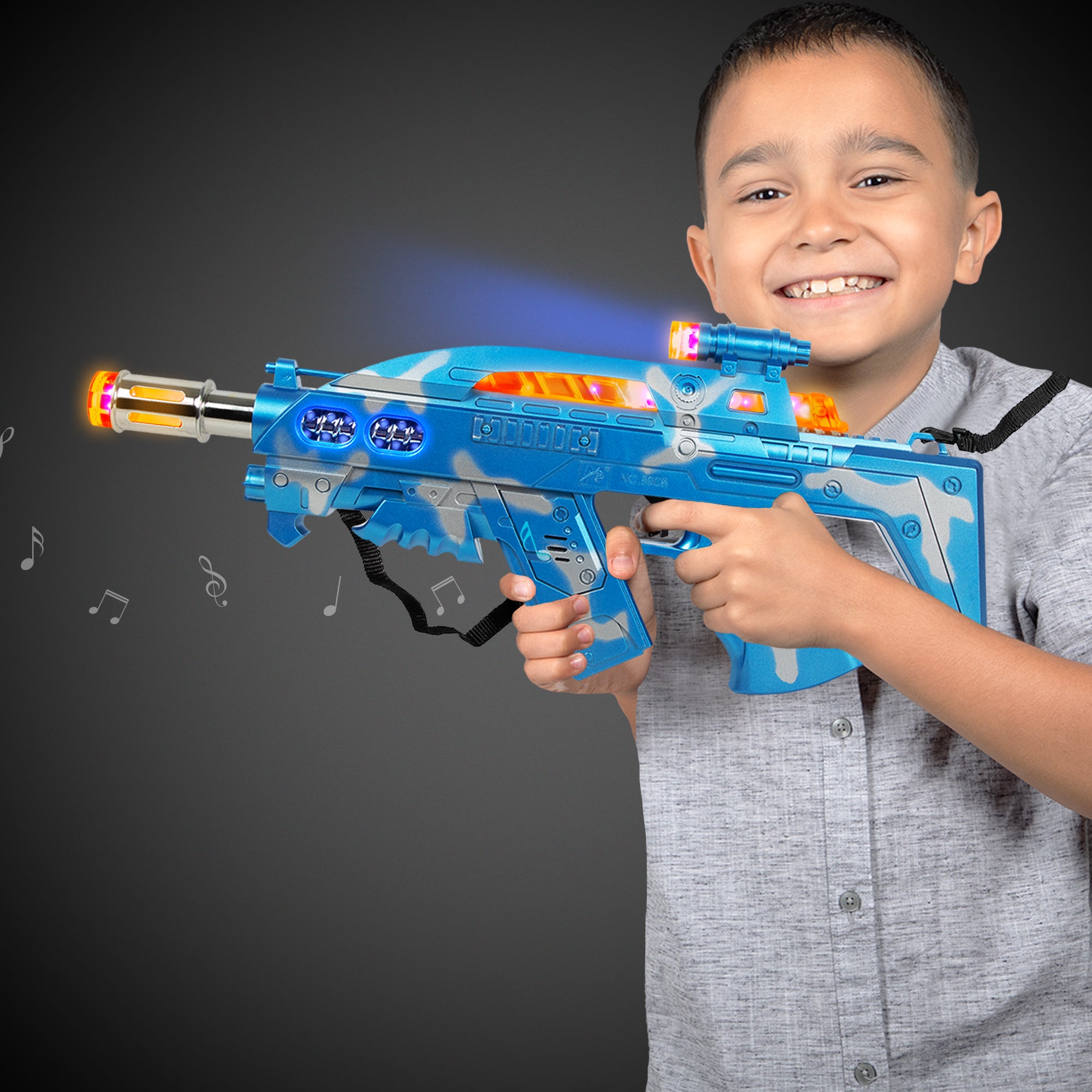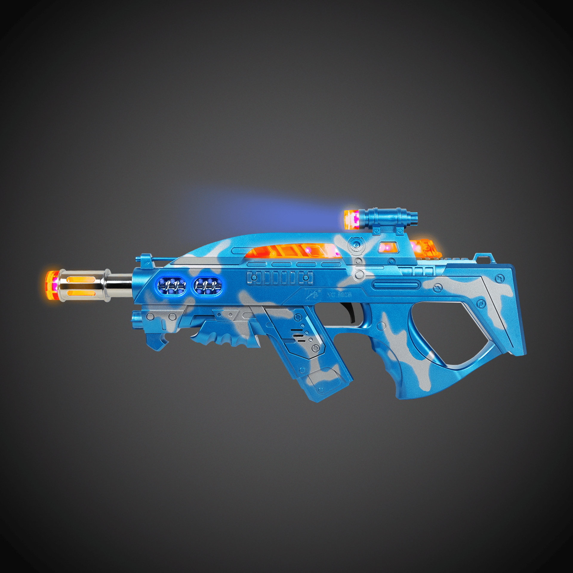 Our blue flashing LED Special Forces P90 Gun includes a strap and makes sounds! (3) AA batteries are included & installed. Each gun is 12 1/2" long x 6 1/2" wide. Sold by the individual gun. Please order in increments of 1 gun. SKU: WEA1100EA