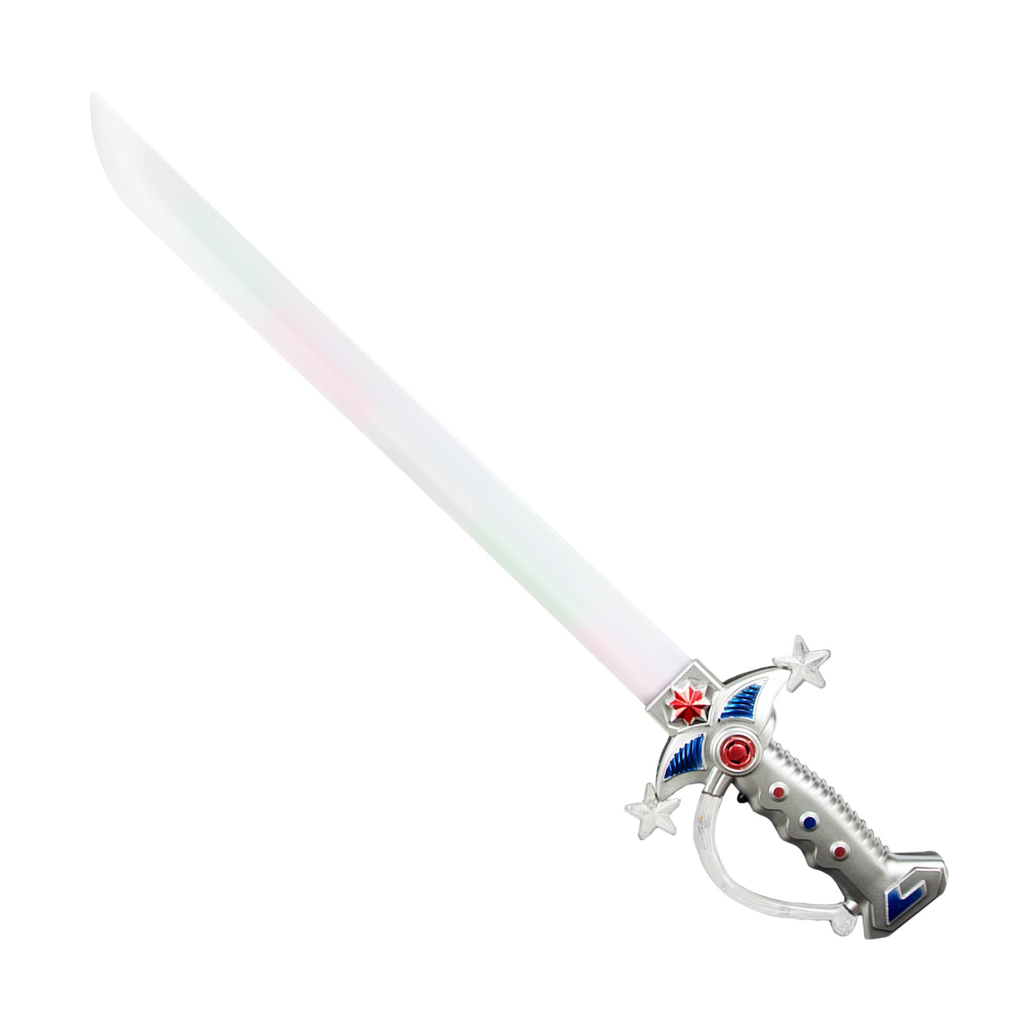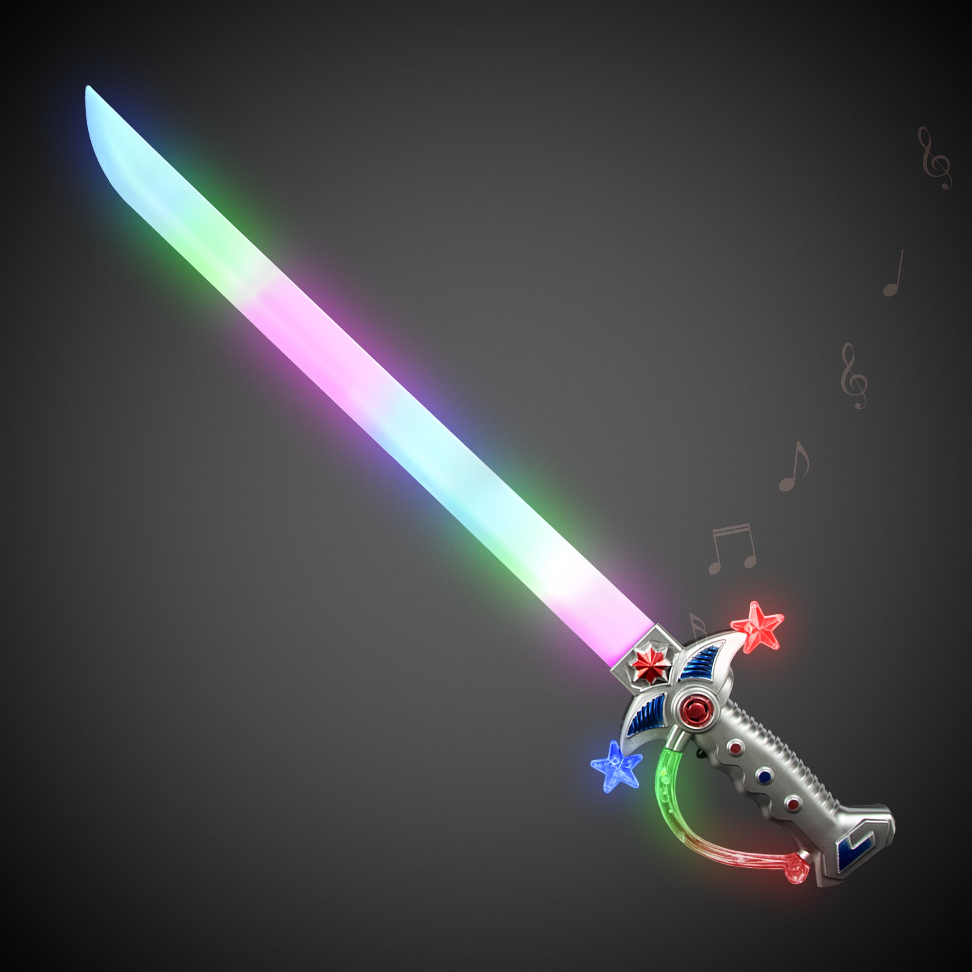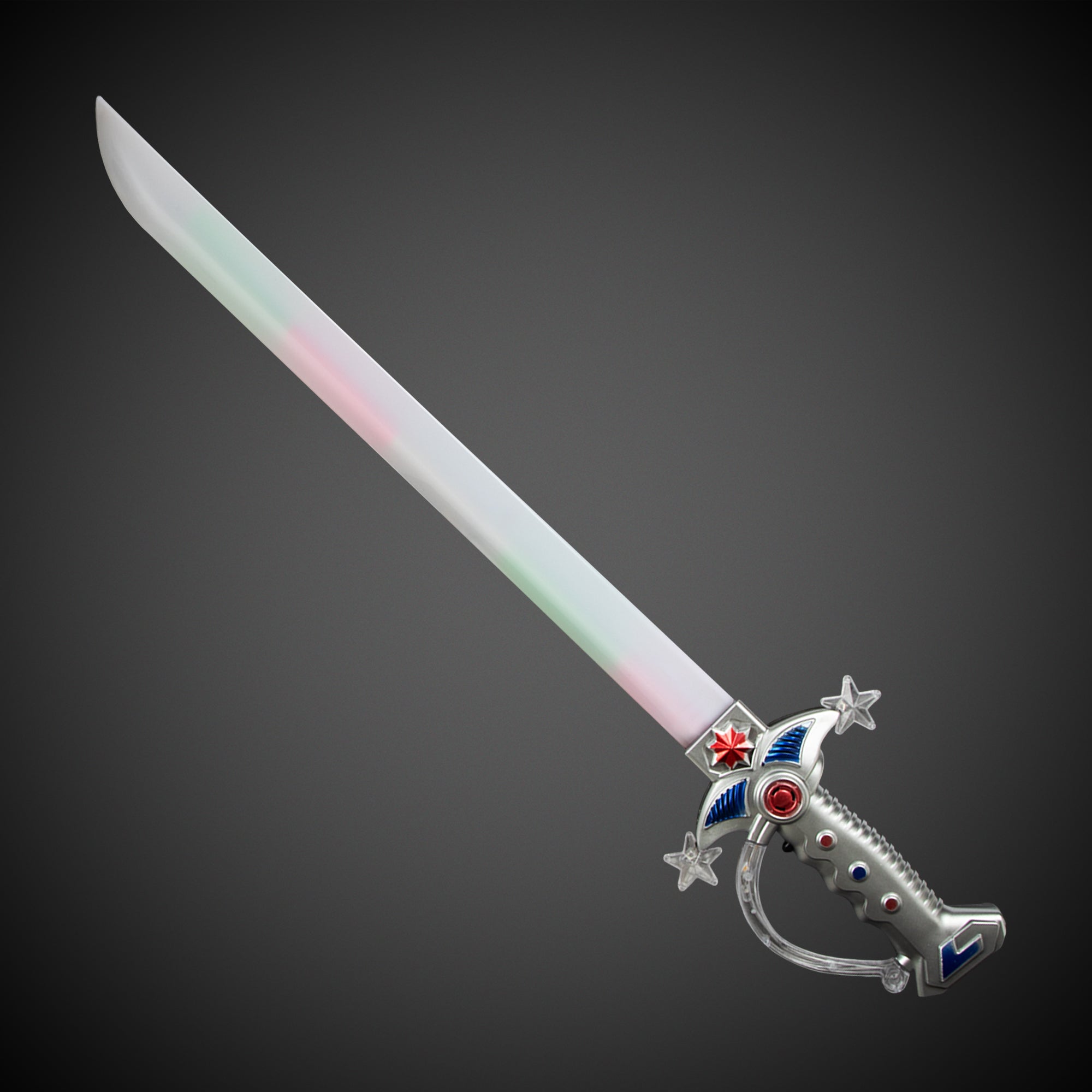 Arrive at your next duel with our LED Star Sword and your opponent will be so wowed they'll surrender in surprise! These light-up swords are the perfect party favors for space, medieval, or ninja-themed birthday parties and will also make any Halloween costume look amazing at night! This sword measures 24" long and features 6 flashing LEDs (2 blue, 2 green, and 2 red). 3 x AA batteries included & installed. SKU: WEA1005EA