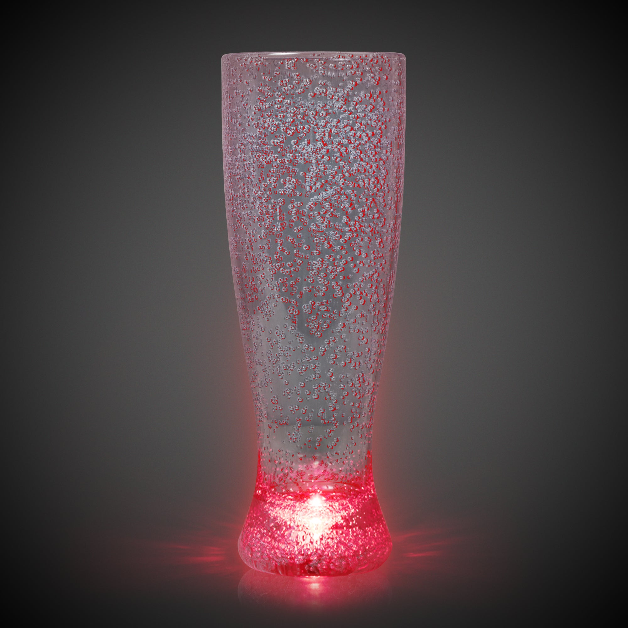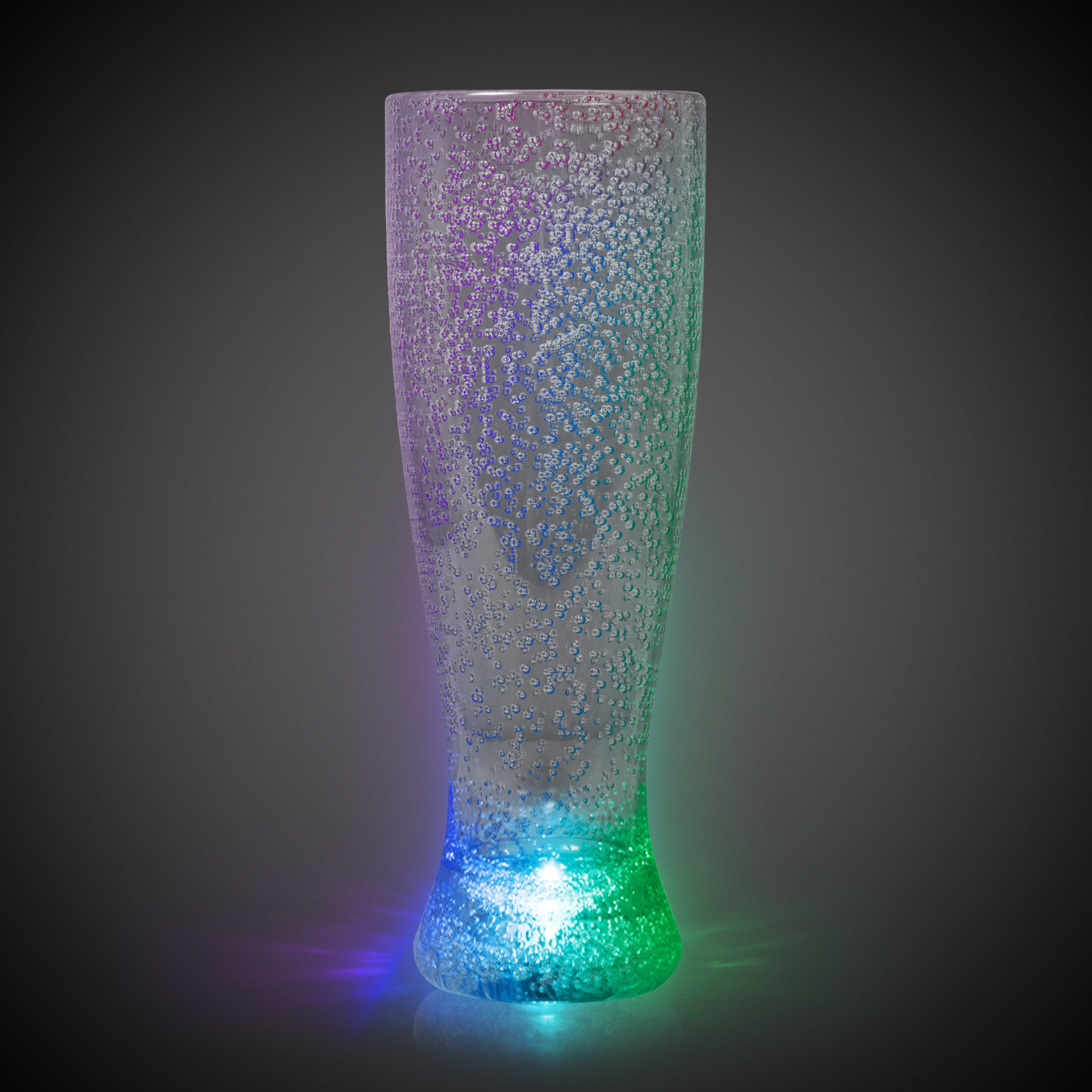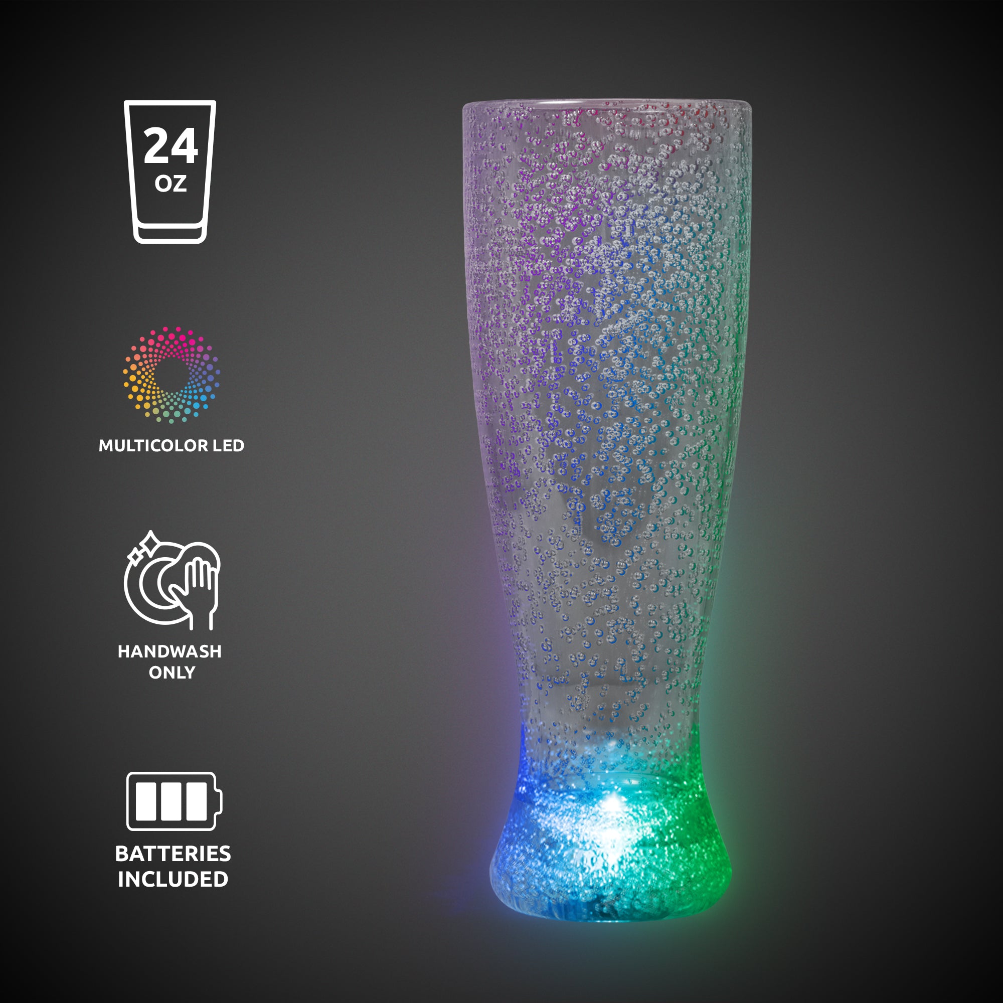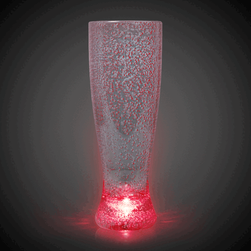 Pour on the fun at any event with our Multi-Color LED Tall Pilsner Glass! This 24-ounce light-up multi-color tall pilsner glass is sure to be a guest favorite, both for its oversized capacity and its unique look. Made of high-quality bubbled acrylic, this light-up multi-color tall pilsner glass has 1 red, 1 green, and 1 blue high-powered LED built into the base of the glass to create a dazzling light show. Choose from a variety of color combinations with the flip of a switch, all of which are enhanced by the light-up multi-color tall pilsner glass's unique bubbled plastic. Each glass comes with 3 AG13 batteries included and installed. This Multi-Color LED Tall Pilsner Glass is hand-washable and reusable. Each 24 oz Multi-Color LED Tall Pilsner Glass is sold by the piece and packed in an individual box. SKU: LIT883EA