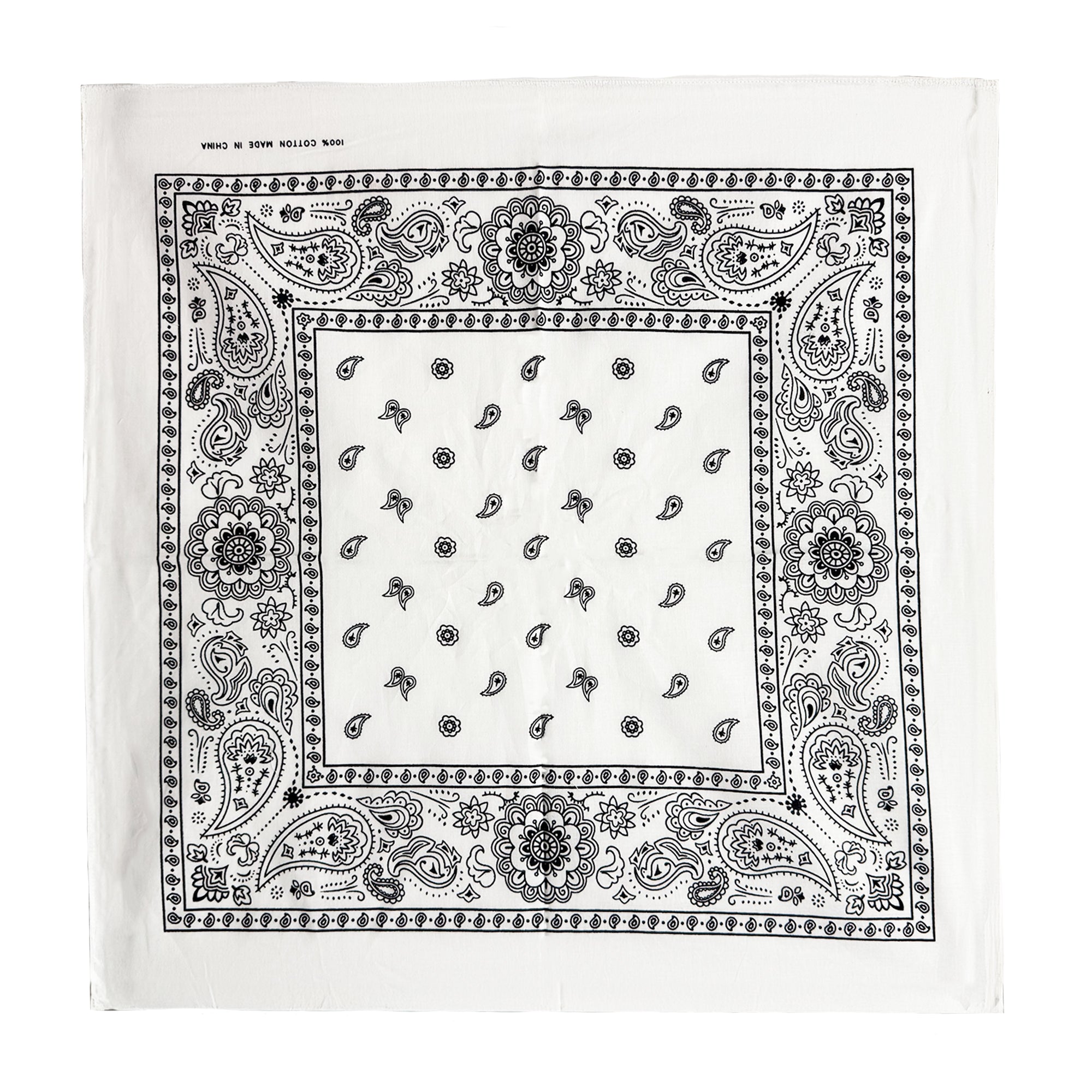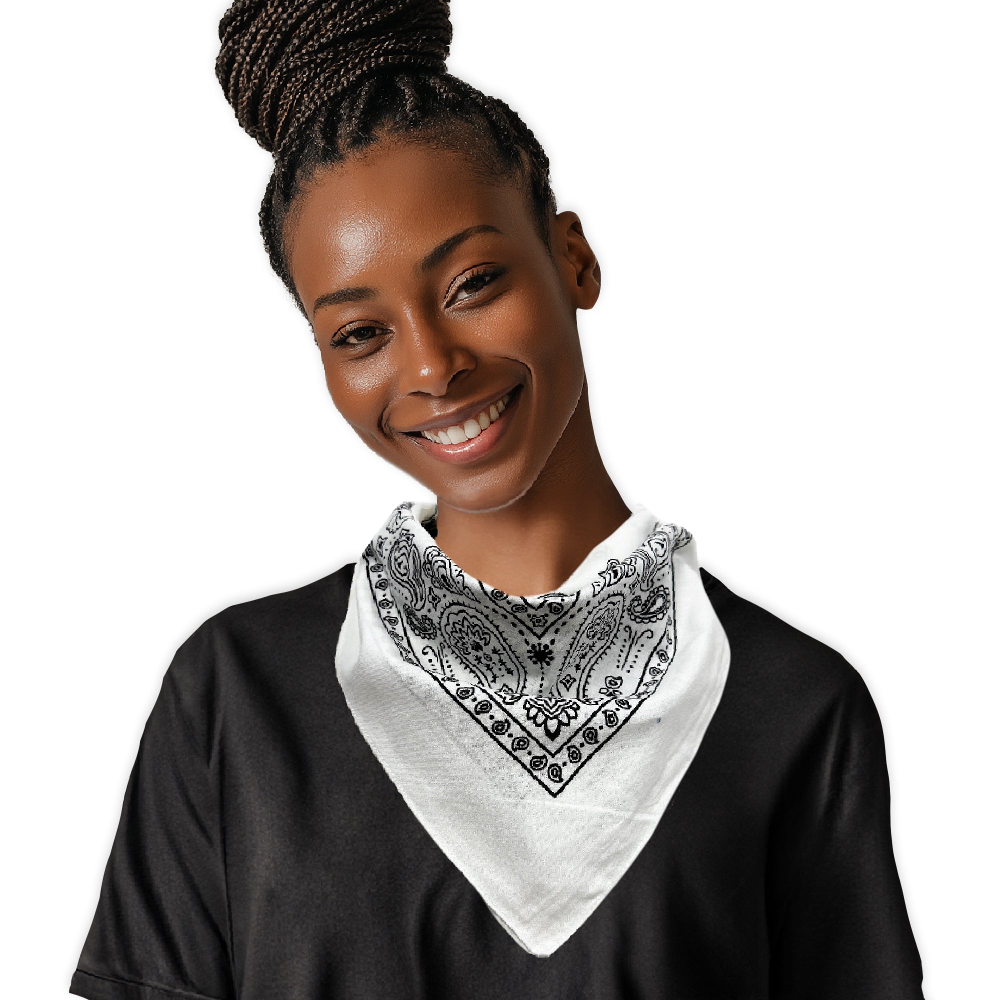 Bring timeless flair to your Western celebration with these charming 22" white cotton bandanas featuring classic black paisley patterns! Packaged by the dozen at wholesale pricing, they're an economical choice for large gatherings. Beyond their bandana duties, they work beautifully as cloth napkins, adding authentic frontier spirit to your tablescape. Stock up and let the good times roll! Sold in a pack of 12 bandanas. Please order bandanas increments of 1 pack. SKU: APR004DZ